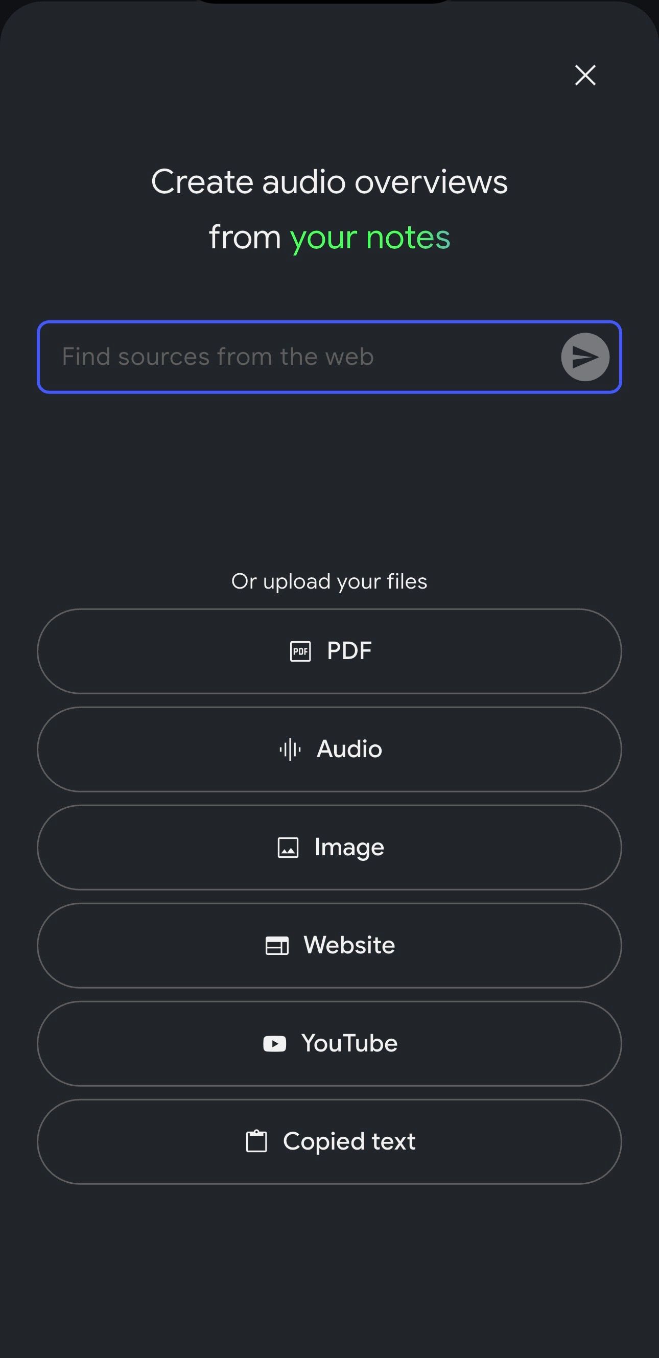 You will then see options to upload your sources — PDF, audio, image, website, YouTube video, or copied text.