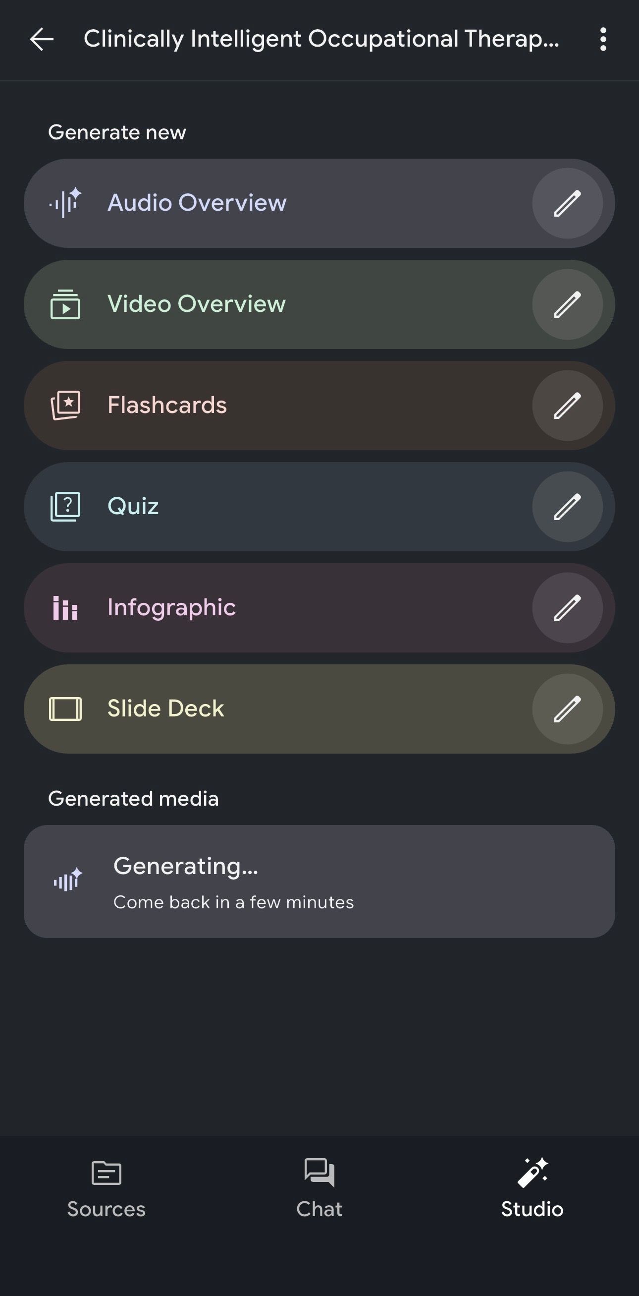 Tap Studio at the bottom of your notebook and you will see a list of things you can generate from your uploaded sources. Audio Overview — a conversational podcast style summary of your content. Video Overview. Flashcards. Quiz. Infographic. Slide Deck.