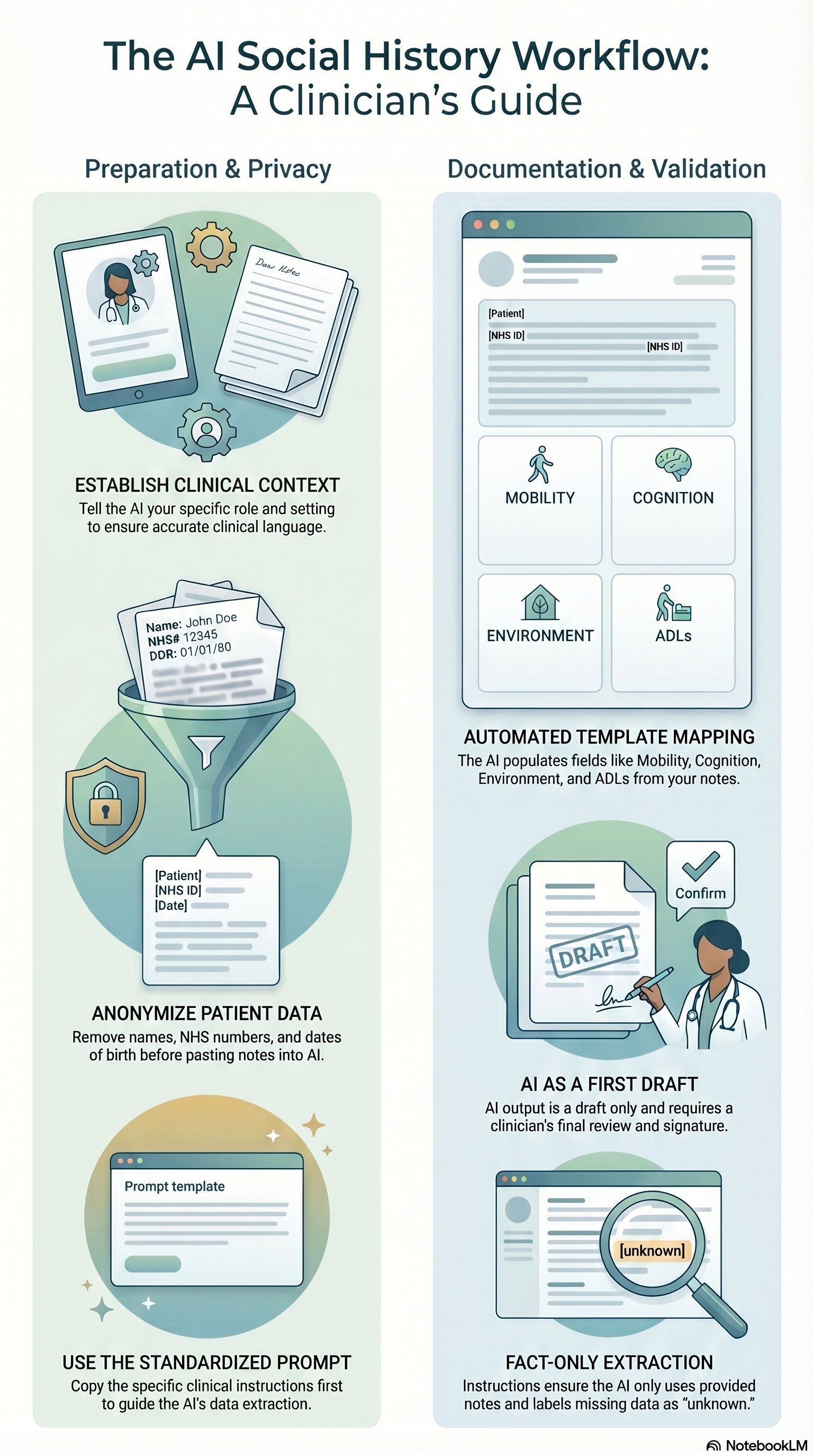 NHS Occupational Therapists by acting as a structured guide for an AI tool like Claude to function as a clinical documentation assistant. Created by a Band 7 NHS Occupational Therapist, it helps streamline the process of writing up social history assessments for Electronic Patient Records.